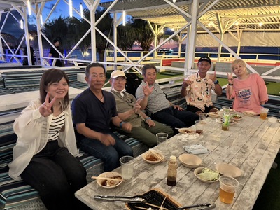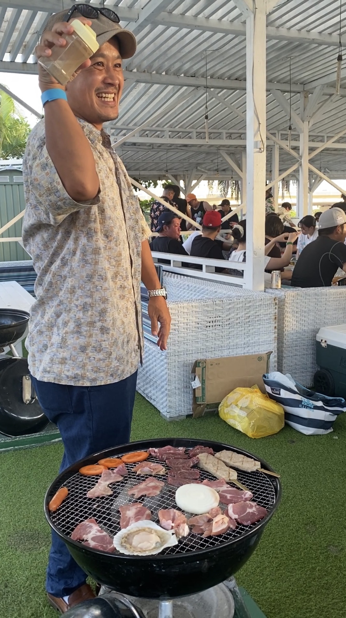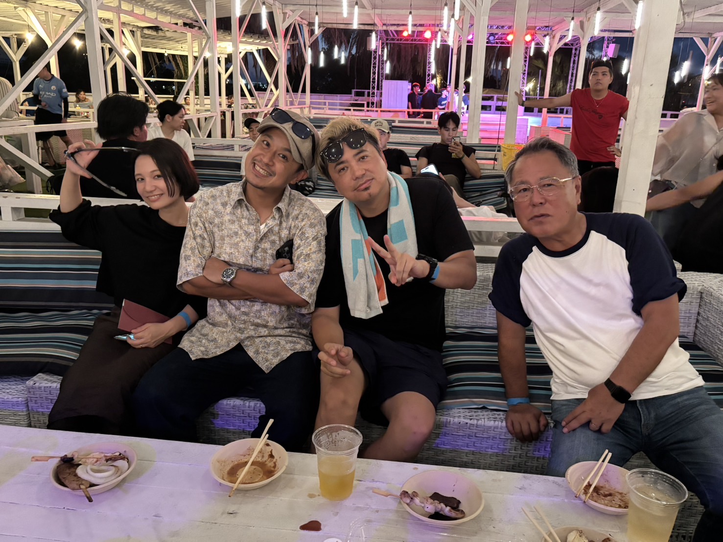 社長自らが焼き場に立ってスタッフに振る舞う場面もあり、ビーチ前のロケーションと食事を囲みながら賑やかに交流できました!