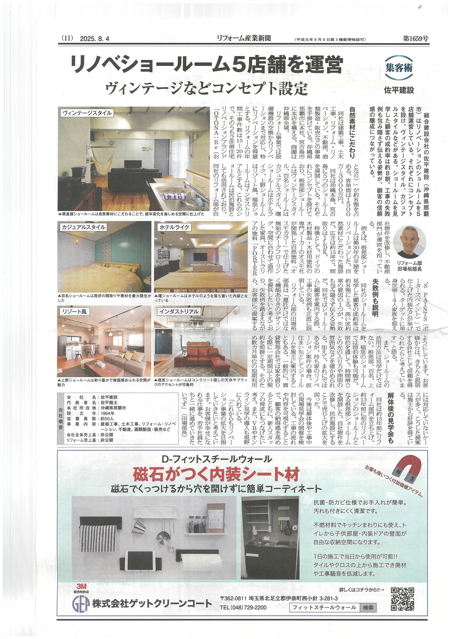 8月4日発行の「リフォーム産業新聞」にて、当社のリノベーション事業を取り上げていただきました。